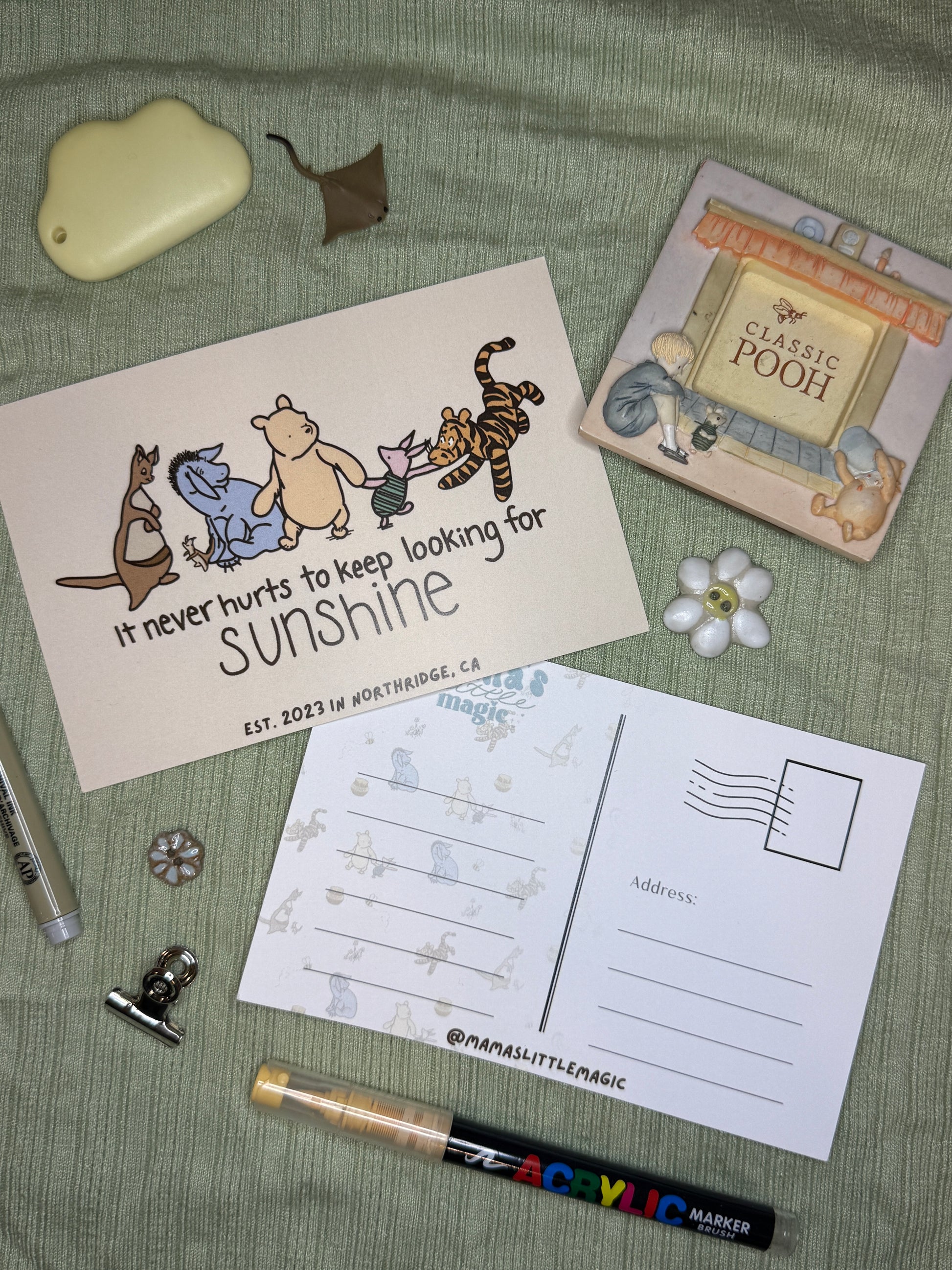 This listing is for ONE postcard inspired by our beloved “Classic Bear” fanny pack design — featuring hand-drawn art of your favorite Hundred Acre Wood characters! 🐻🌳